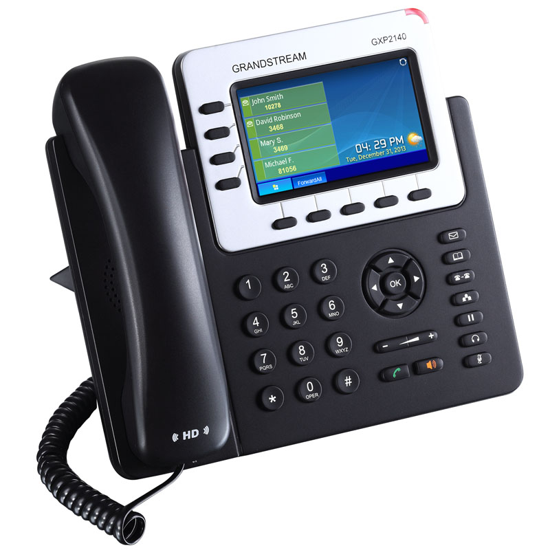 GXP2140是一款集时尚和科技为一体的智能高端IP电话,采用优雅大气的外观设计,标配4.3寸TFT真彩LCD屏,支持4线路账号, 5个可编程软按键,双千兆网口,USB数据接口,内置集成POE和蓝牙、EHS无绳耳麦适配器,支持五方会议及丰富的SIP/Web集成业务。GXP2140具有卓越的高清语音品质,丰富的电话系统功能,并提供用户个性化的信息定制和企业ICT集成接口,支持外接4块液晶扩展板(共160个双色BLF按键),支持自动部署和先进的安全保护机制,广泛的兼容业界主流IMS/NGN/IPPBX/IPCC平台。