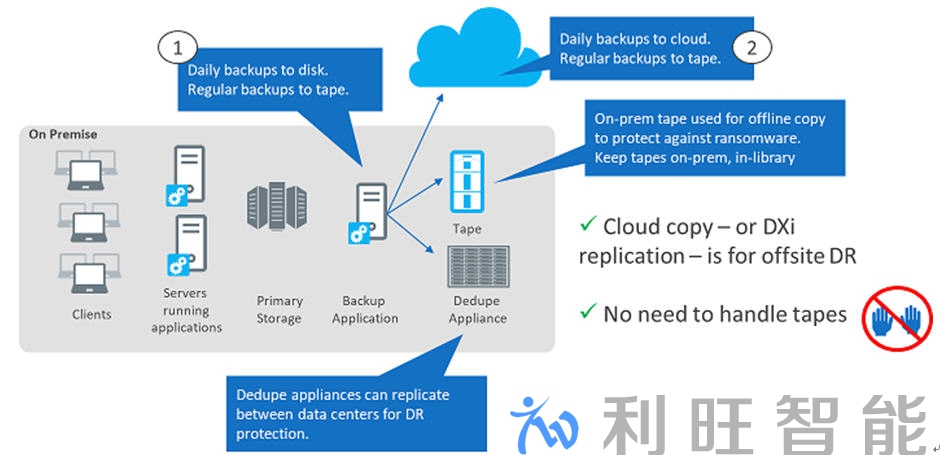 在这种方法下,磁带满足离线存储解决方案的要求。备份将复制到磁带,并且磁带将作为“安全的脱机副本”的数据保存在磁带库中,以防止恶意软件的攻击。由于磁带保留在磁带库中,磁带处理不再是问题,磁带处理较少可减少存储介质损坏的可能性。
