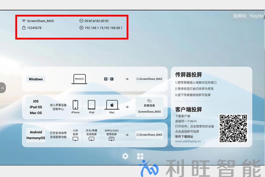 热点名称及热点密码、MAC地址及主机IP地址、投屏码;
