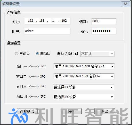 通道设置中可以选择窗口模式等,最多四窗口,可以分别将IPC添加到窗口中。设置完成